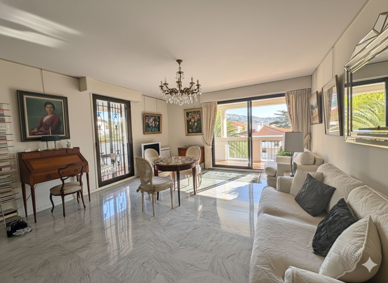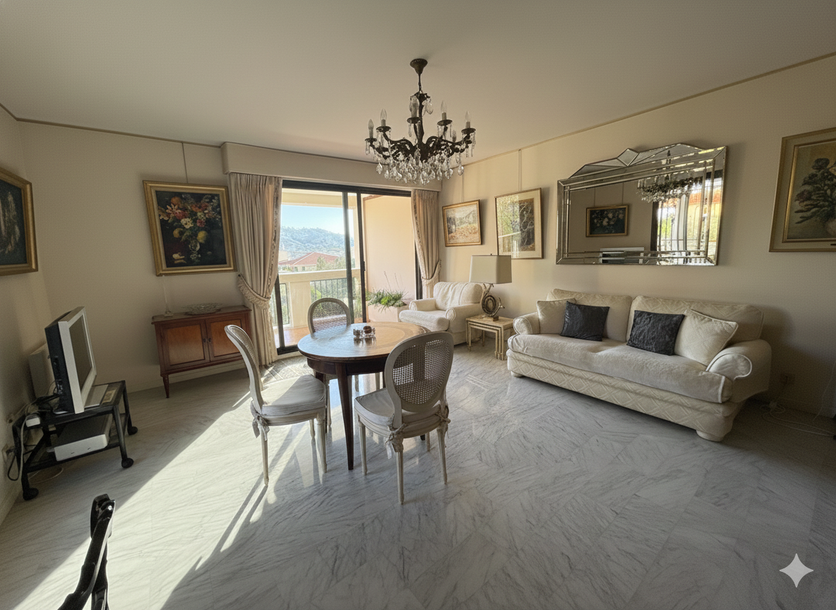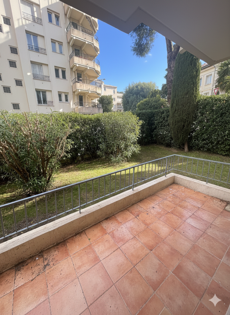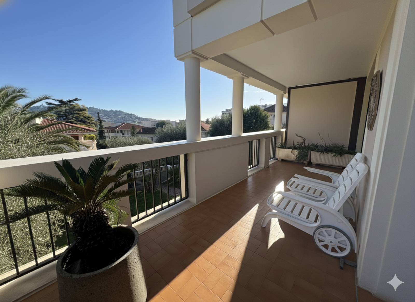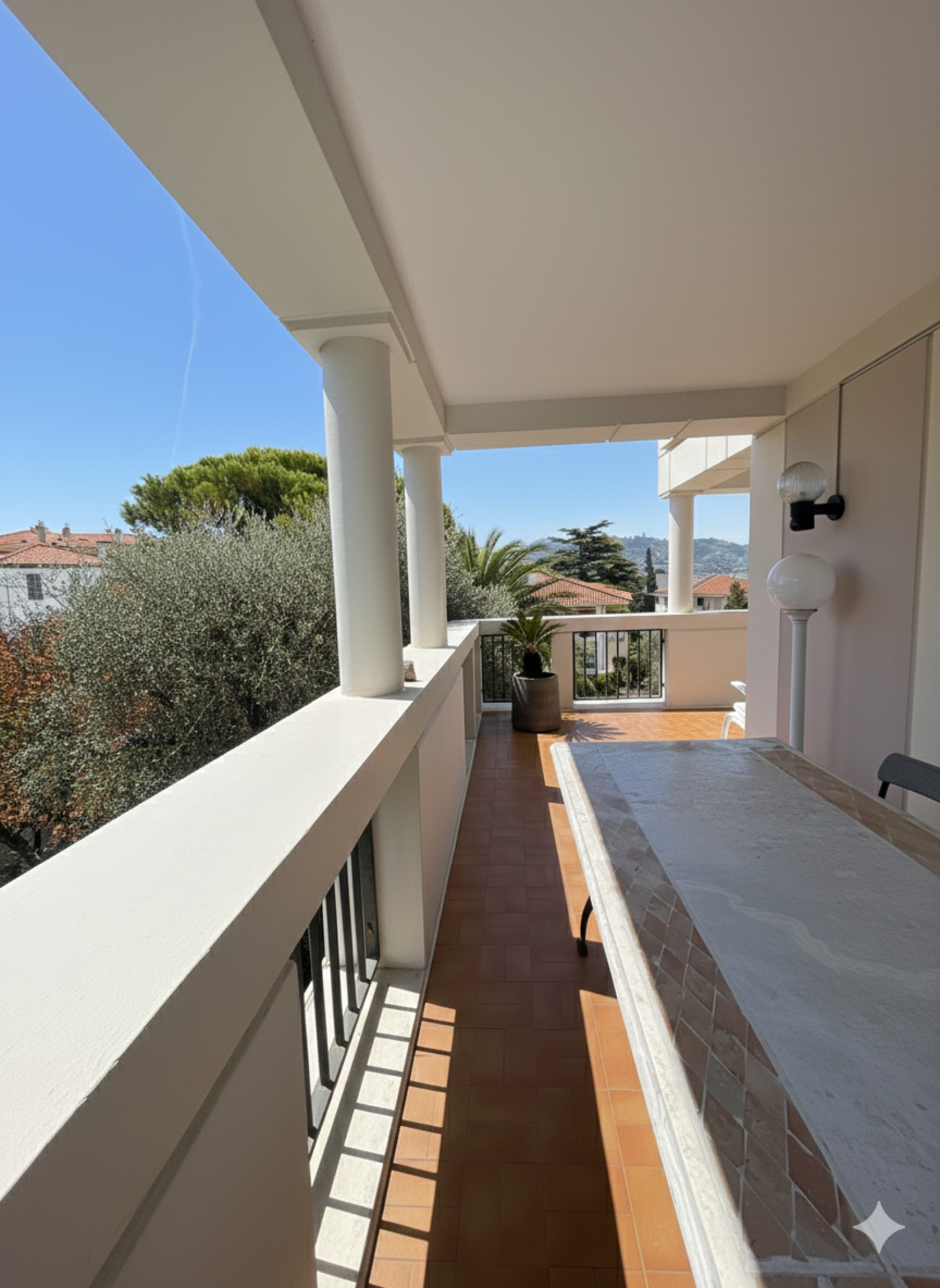 Le point fort de ce bien est sa grande terrasse d'angle. Elle offre un espace extérieur généreux avec une vue dégagée sur le parc de la copropriété, idéale pour profiter du climat azuréen au calme.