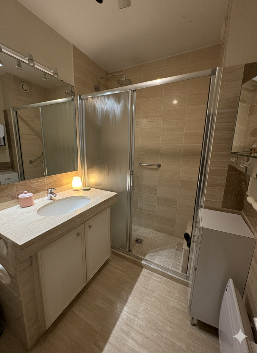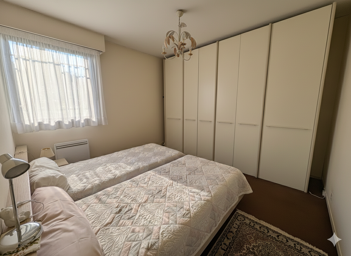 Espace nuit : Deux chambres confortables et une salle d’eau élégante en travertin.